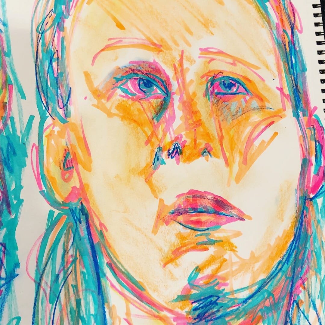 You don’t need a lot of colors. I mostly use a blue, red, green, orange, and white. Below you can see a recent figure study I created using only three chalk pastel colors and three acrylic markers. This gave a more vibrant, expressive result. While you can rub a thin layer of charcoal or chalk pastel onto paper first as long as it is well absorbed, for best results use chalk pastel last. You can also use layers of mediums and fixatives to rework areas for special effects.
