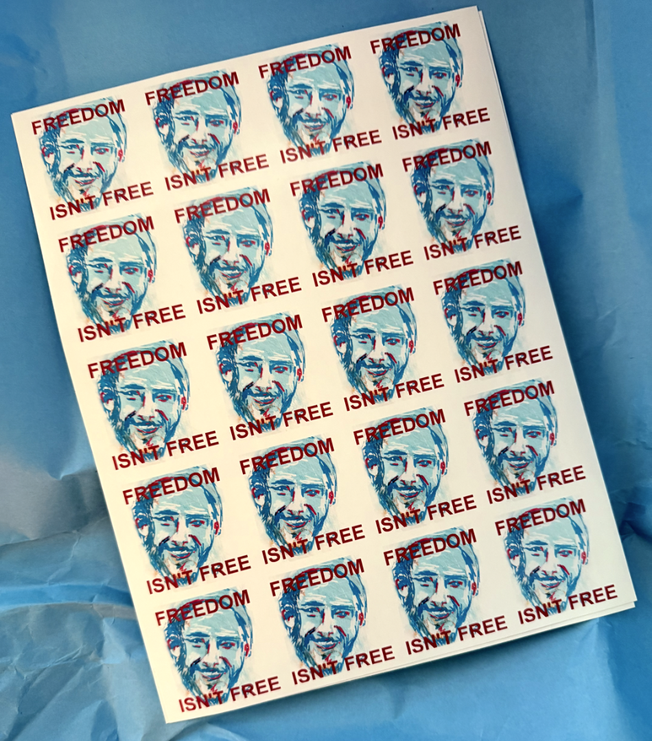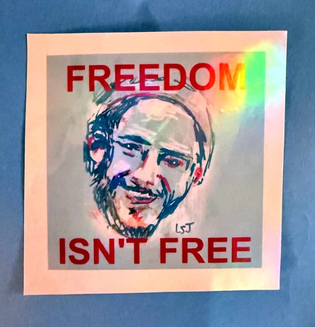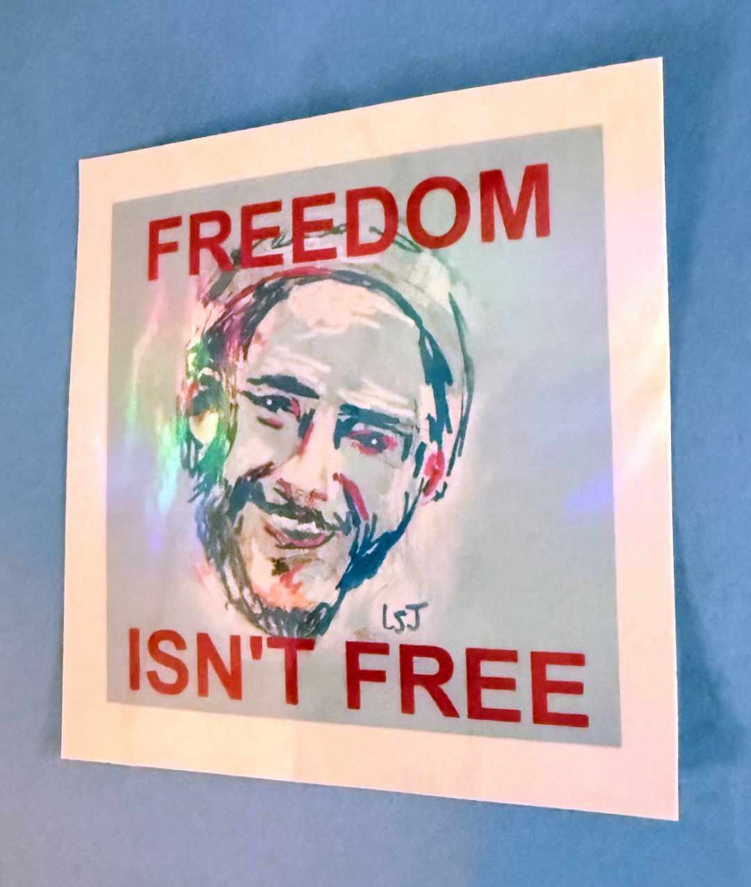 Art Stickers based on the original painting “Alex Pretti Portrait in Blues, Red and White”, with text “Freedom Isn’t Free” in red lettering. These two inch square stickers are designed and hand cut by the artist. Â Price is for quantity of 1 art sticker unless specified otherwise in the variation.