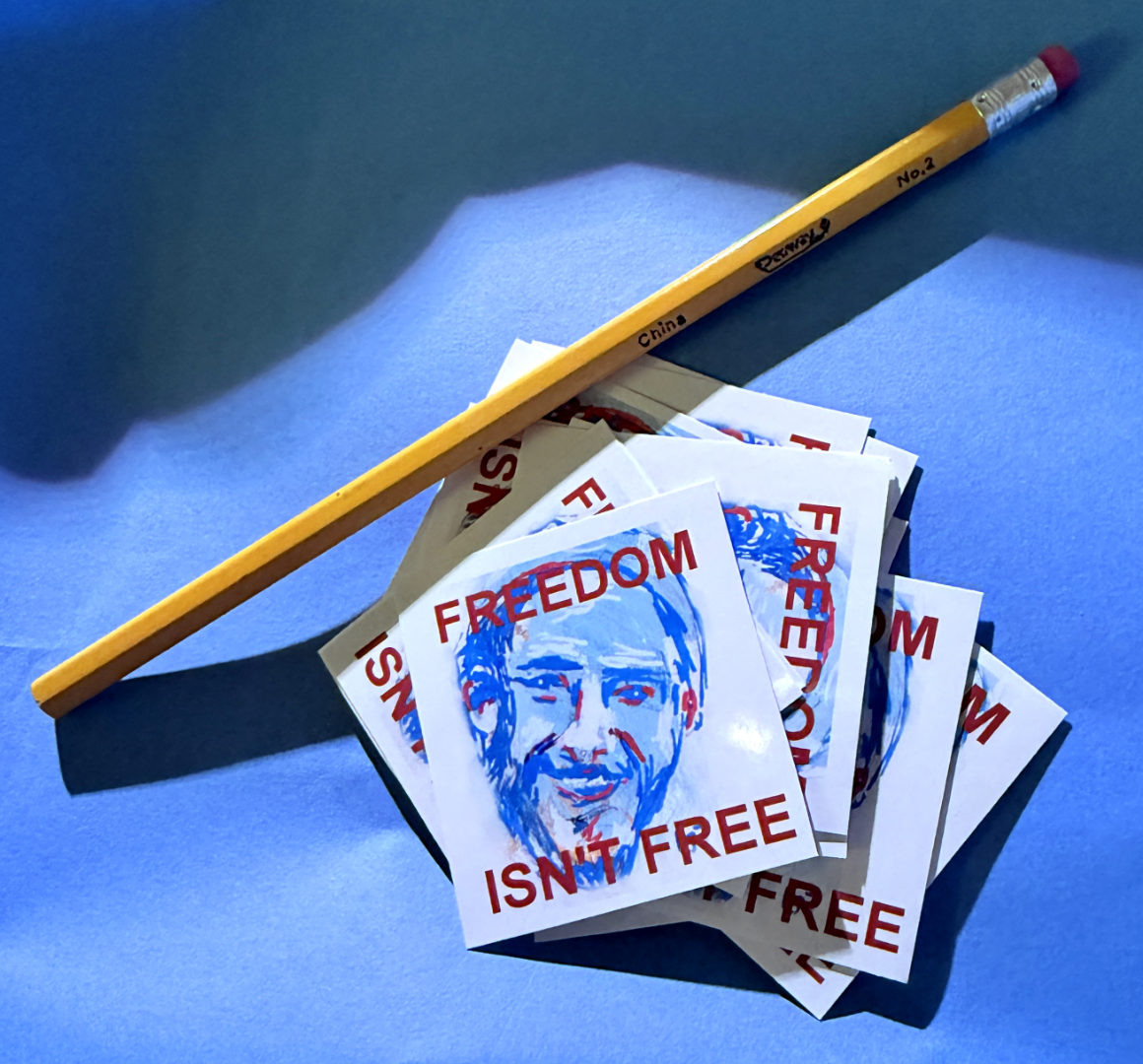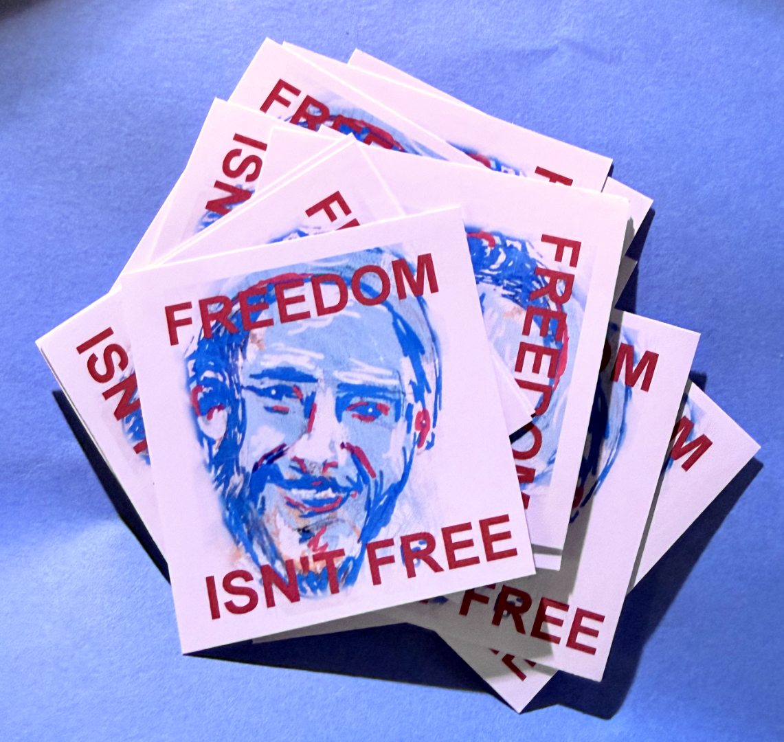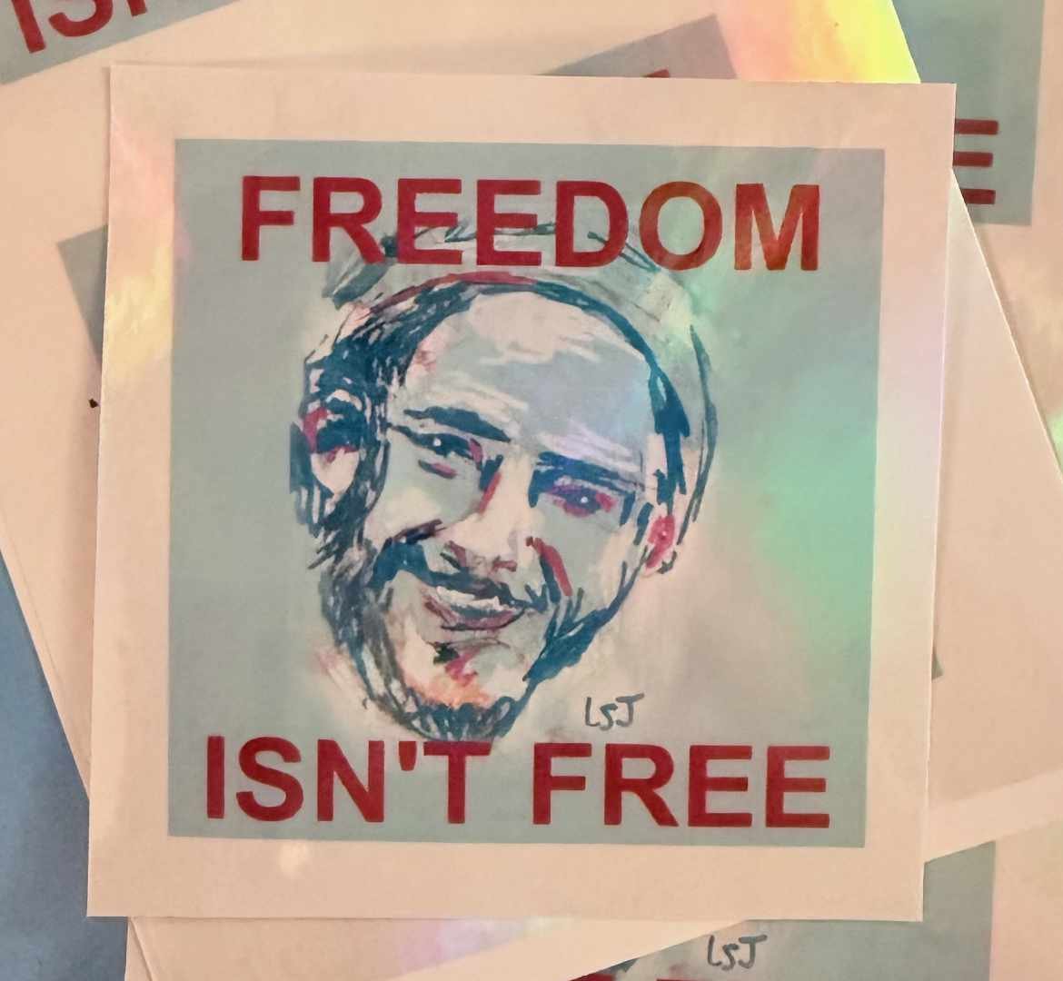 Art Stickers based on the original painting “Alex Pretti Portrait in Blues, Red and White”, with text “Freedom Isn’t Free” in red lettering. These two inch square stickers are designed and hand cut by the artist. Â Price is for quantity of 1 art sticker unless specified otherwise in the variation.
