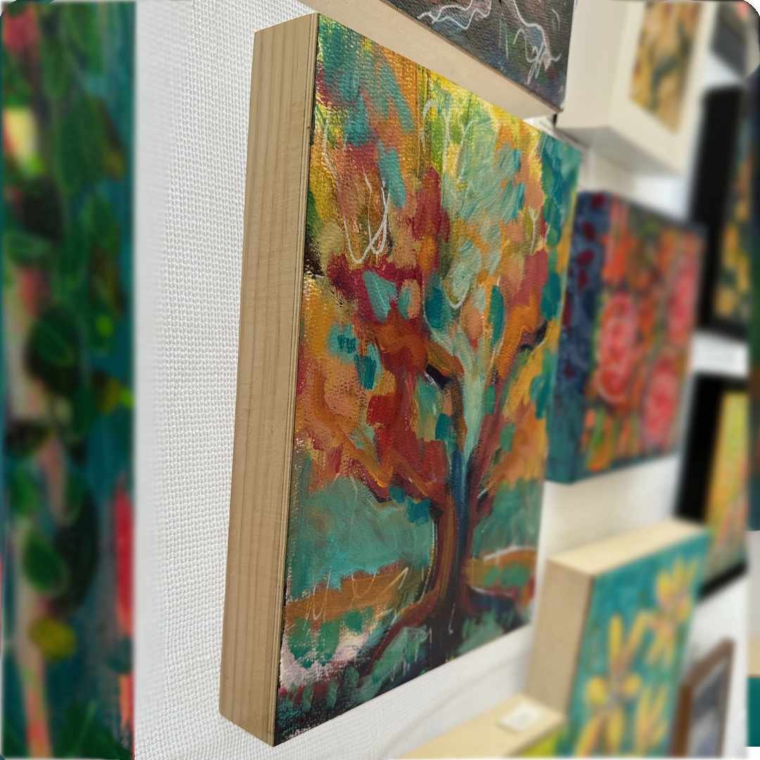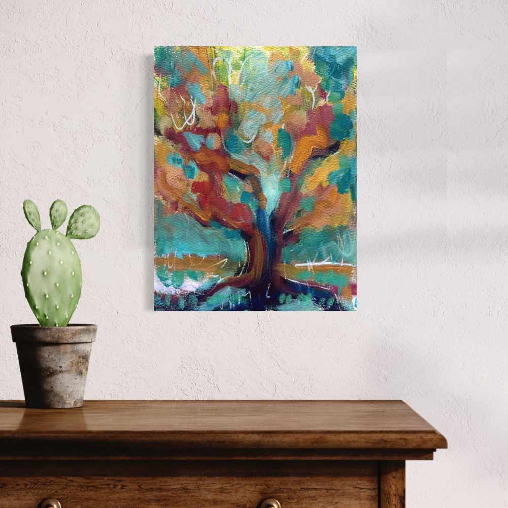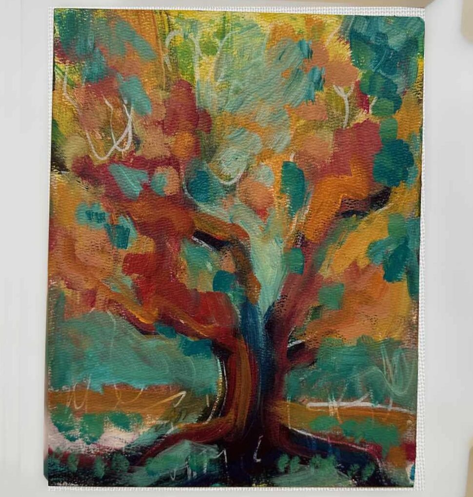 Courageous is a small memory tree painting in acrylic on watercolor paper that has been permanently mounted onto a bass wood cradle. Vibrant tufts of orange, yellow and red fall leaves burst from the branches of a tree. The organic, flowing forms reach to the sky. A bllue green teal background sets off the leaves.