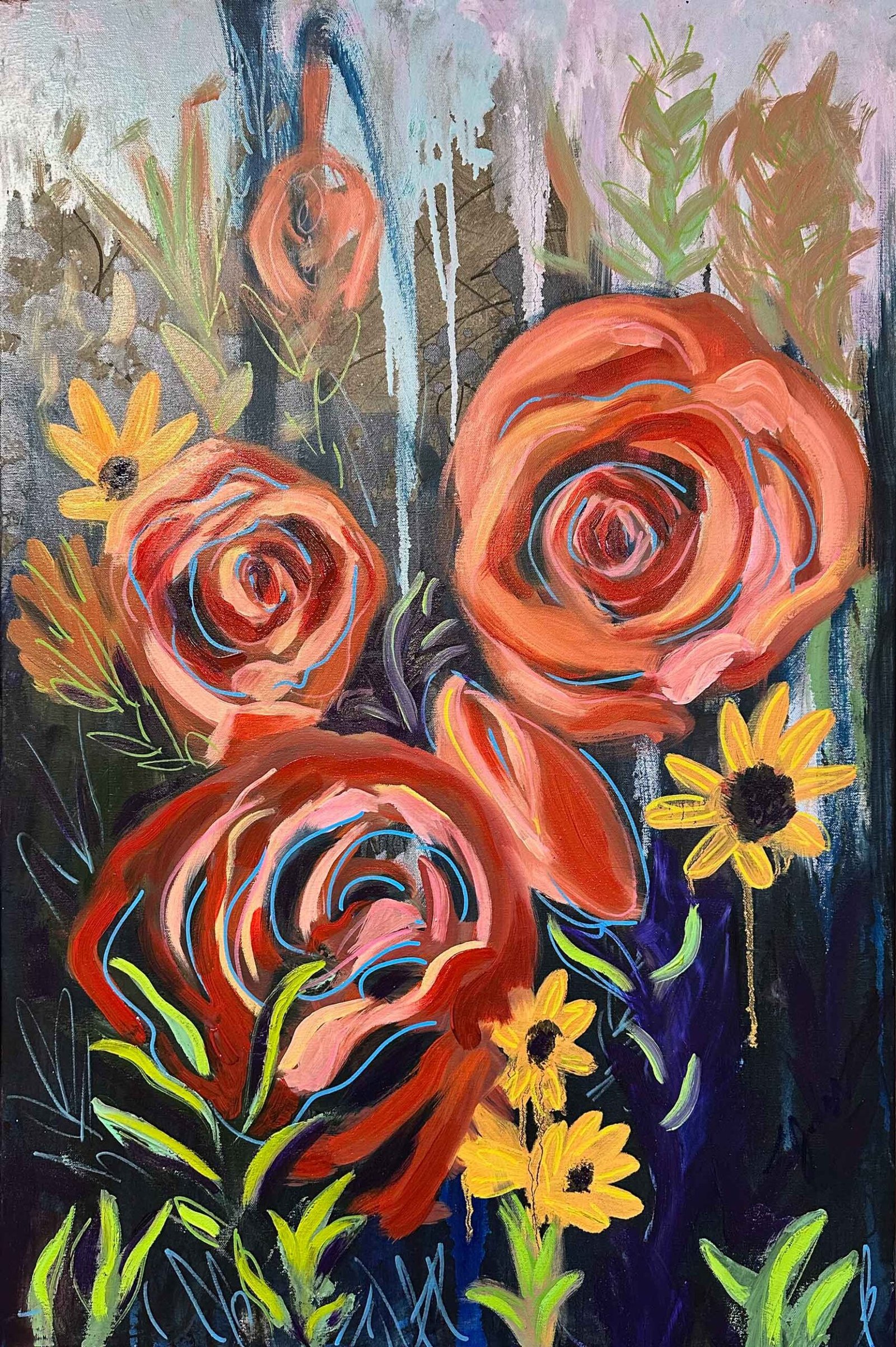 A larger than life bouquet of abstract flowers melts and drips down the canvas. Capturing the tender side of love. this original painting is made with layers of alcohol inks, acrylics and oil paint on gallery depth stretched canvas and finished with a protective varnish. 36 inches by 24 inches in size, approximately 1 1/2 inches in depth, painting on the sides.
