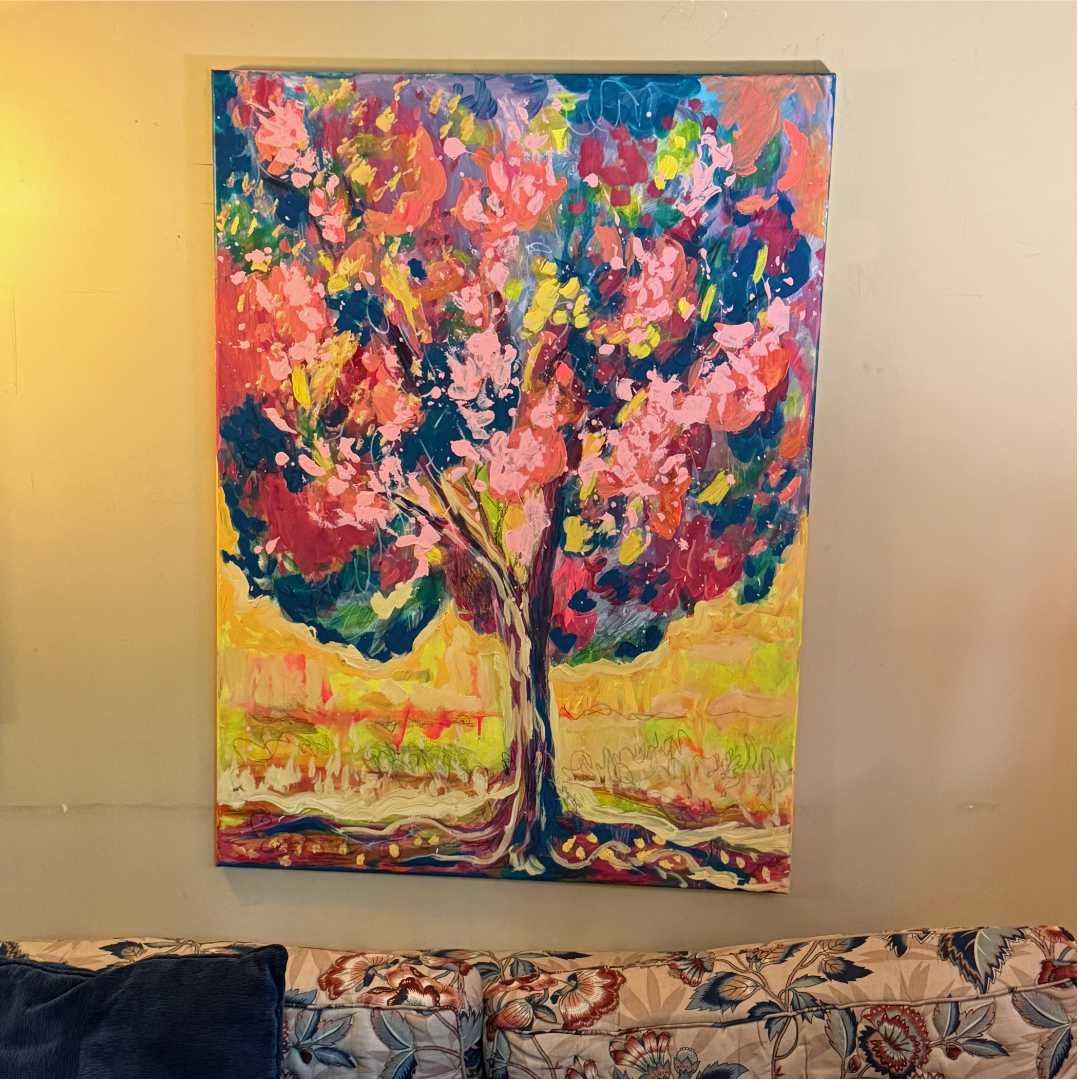 Vibrant abstract tree on a fluorescent yellow green background. 30 x 40 x ,75 inches. Memory of Sunset is a look back at perfect afternoons when the sky glows and troubles seem far away. Inspired by The Lorax and the brilliant colors of fall trees in North Georgia.